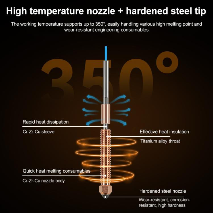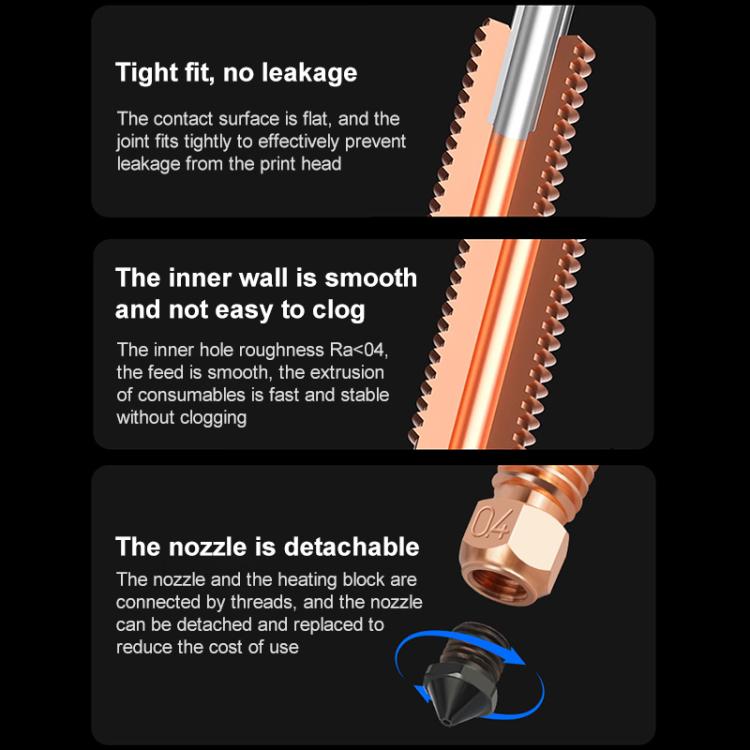 2. Premium Material: The heat break of nozzle pipeline is made of titanium alloy, which can effectively reduce heat conduction. 0.4mm nozzle is made of copper alloy and hardened steel bimetallic material, high thermal conductivity, high hardness, better performance.