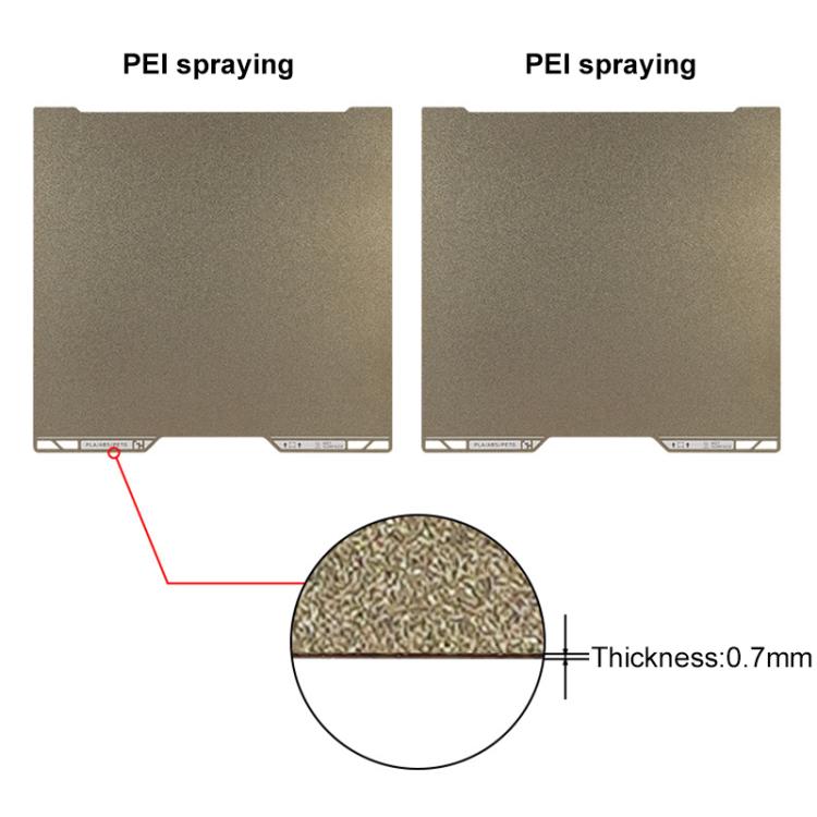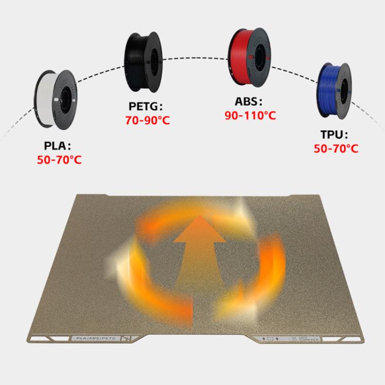 2. The premium PEI coating is highly versatile, compatible with a wide range of materials such as PLA, PETG, ABS, TPU. Offering strong adhesion, excellent wear resistance, and heat tolerance, its considered the ideal surface for most printing conditions.