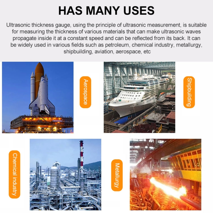 Scope of application: This unit is suitable for measuring materials that are good ultrasonic conductor such as metal, plastic, acrylic, glass etc., as long as the measured part in two parallel surfaces for measurement of thickness. This unit is not suitable for cast iron due to its big crystalloid composition.