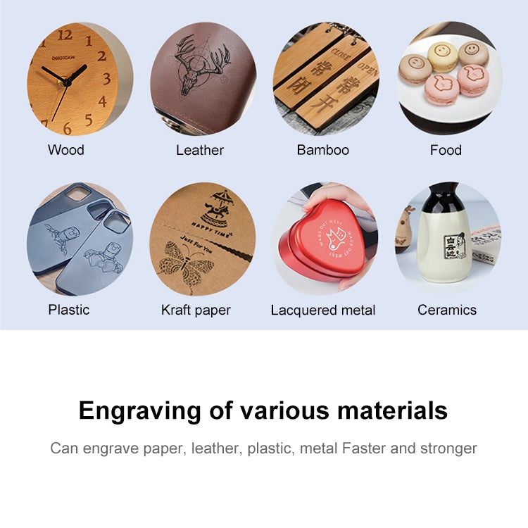 8. Three connection modes: Wi-Fi connection (easy to operate on the app page), computer operation (diverse creation of pictures and text), offline engraving (cloud storage and memory function, please external connection, one-key repeat engraving), the engraving machine matches professional applications.