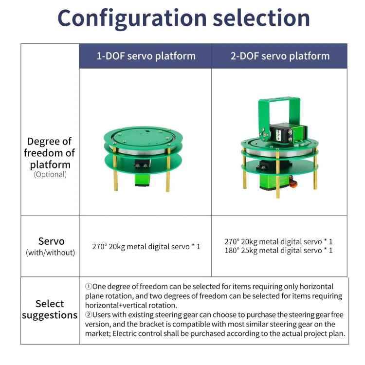 1. Two-dimensional electric pan-tilt, specially designed for electronic design competitions, available in one or two degrees of freedom, and with optional servo configurations (suggestions for selection: 1. For projects that only require horizontal rotation, choose one degree of freedom; for projects that require both horizontal and vertical rotation, choose two degrees of freedom. 2. Users who already have servos can purchase the version without servos, and the bracket is compatible with most similar servos on the market.)
