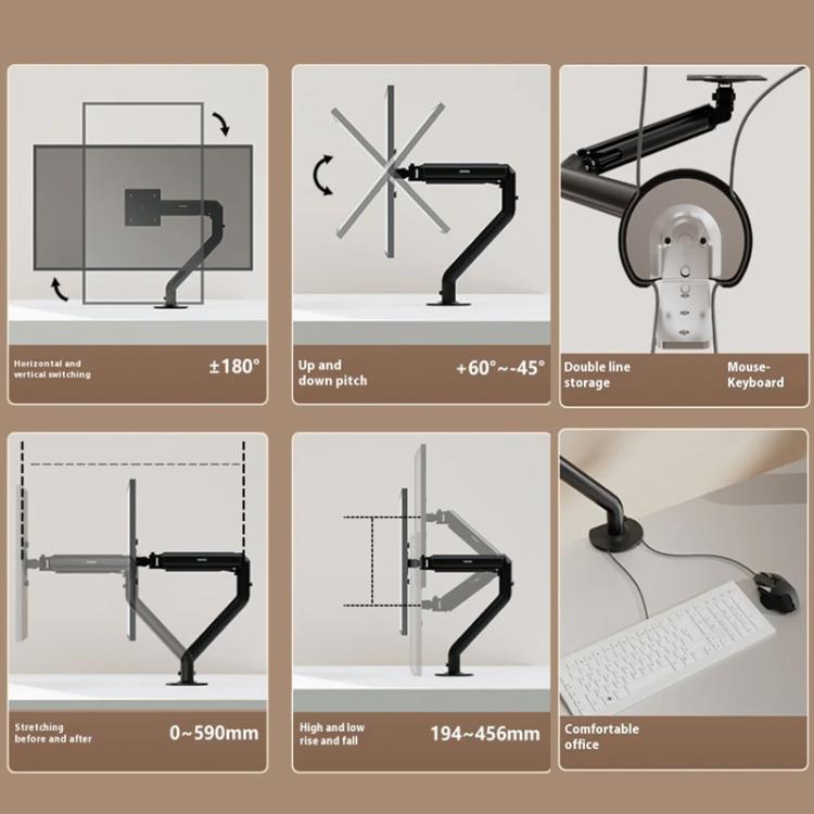 3. 90-degree Tilt Adjustment: Up/down tilt angle range of +60 to -45 degrees. Front-back extension range: 0–590 mm. Height adjustment: 194–456 mm. One-click switching between horizontal and vertical screens for full-angle control!