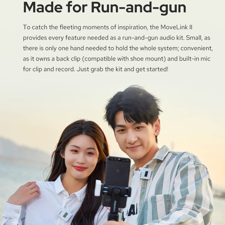 1. Made for Run-and-gun: To catch the fleeting moments of inspiration, the MoveLink II provides every feature needed as a run-and-gun audio kit. Small, as there is only one hand needed to hold the whole system; convenient, as it owns a back clip (compatible with shoe mount) and built-in mic for clip and record. Just grab the kit and get started!