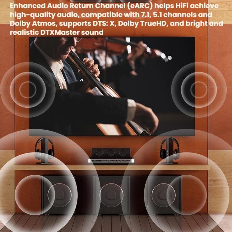 5. Enhanced Audio Return Channel (eARC) delivers Hi-Fi-quality sound, compatible with 7.1, 5.1 channels, and Dolby Atmos, supports DTS Master DTS X, Dolby TrueHD, with bright and authentic sound