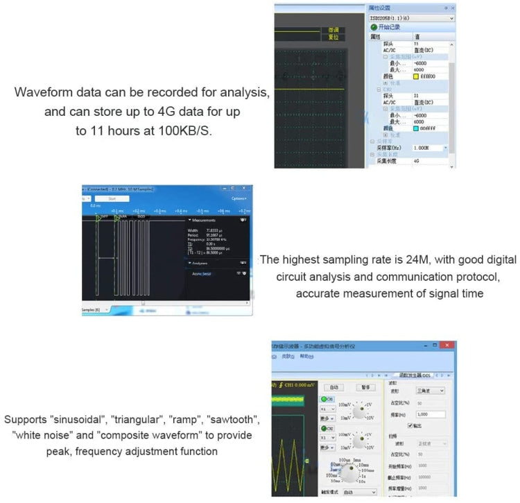 6. Application: 3-in-1 multi-function, with functions of digital oscilloscope, spectrum analyzer and data recorder; oscilloscope probe uses standard BNC connector, and can also be replaced with 100X or high-voltage probe and probe