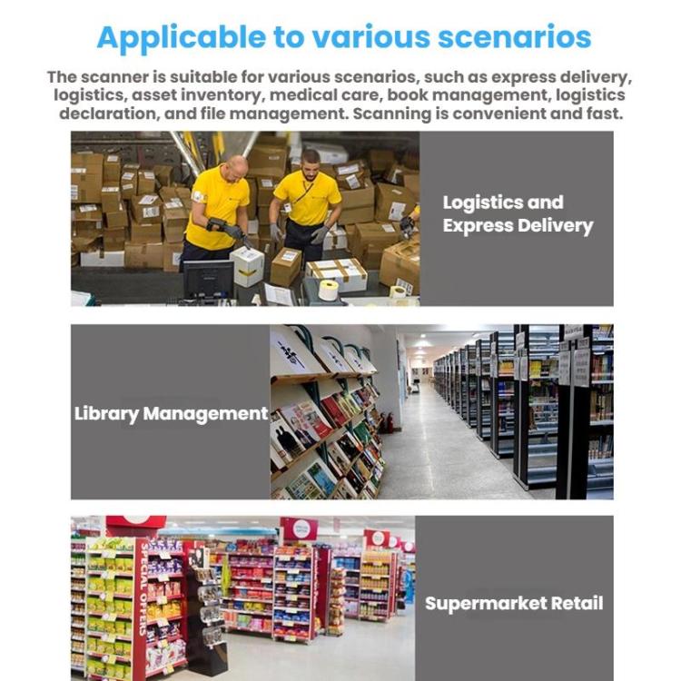 11. The scanner is suitable for a variety of applications, including express delivery, logistics, asset inventory, healthcare, library management, customs declaration, and file management, offering convenient and fast scanning.