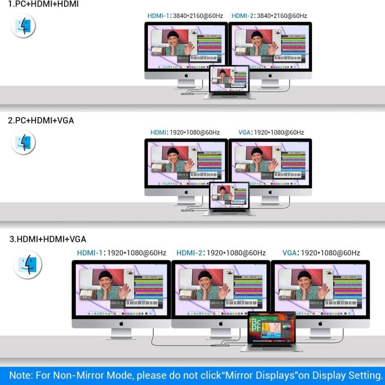 2. Triple-Screen Productivity: PC+HDMI+HDMI/PC+HDMI+VGA/HDMI+HDMI+VGA