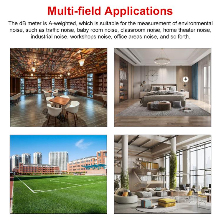 10. The decibel meter is A-value weighted and is suitable for measuring ambient noise, such as traffic noise, baby room noise, classroom noise, home theater noise, industrial noise, workshop noise, office area noise, etc.