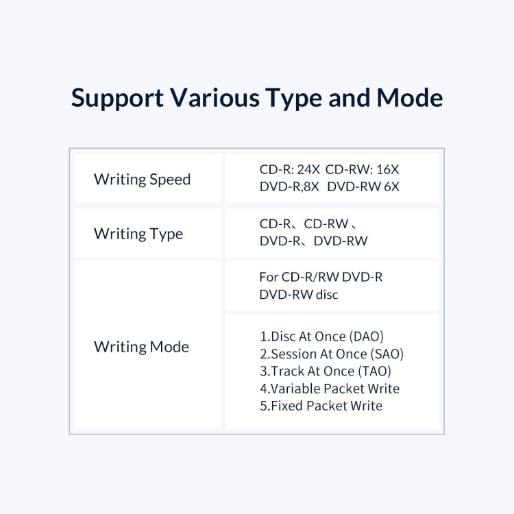 9. Supported recording modes: For CD-R/RW DVD-R/DVD-RW discs: Disc Once (DAO); Session Once (SAO); Track Now (TAO); Variable Packet Write; Fixed Packet Write enter