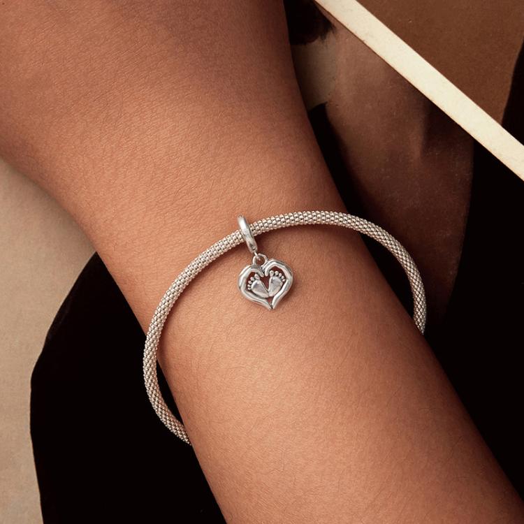 S925 Sterling Silver Heart Footprint Pendant Mother Day Beads
