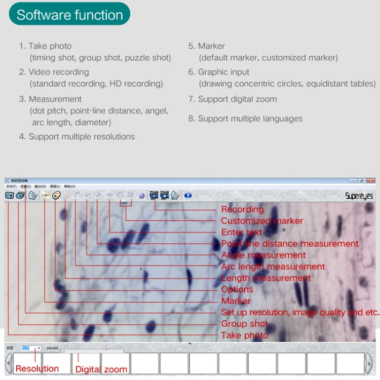 16. Using hardware 2 million pixel chip, resolution of 1600x1200, clear imaging can be used as a microscope, can also be used for high-definition endoscopes
