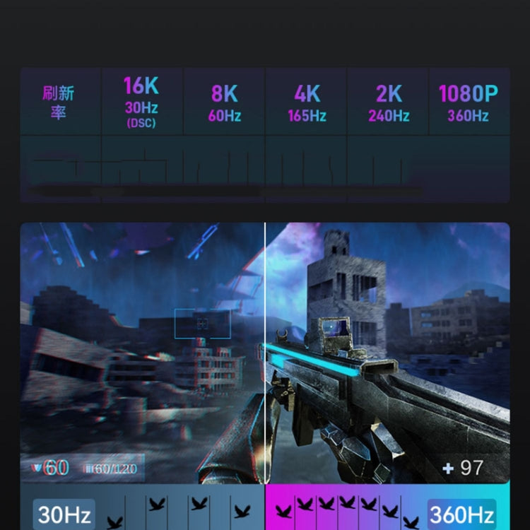 7. Refresh rate: 1080P@360Hz/2K@240Hz/4K@165Hz/10K@30Hz(DSC)/16K@30Hz(DSC)/1080P@240Hz/2K@165Hz/4K@144Hz/8K@60Hz