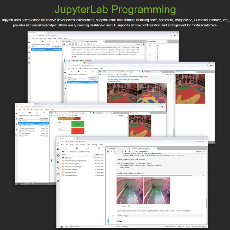 8. JupyterLab programming: JupyterLab is a web-based interactive development environment, supports multi data formats including code, document, image/video, UI control interface, etc., provides rich visualized output, allows easily creating dashboard and UI, supports flexible configuration and arrangement for modular interface.