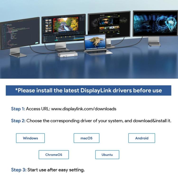 1. Please follow the instructions to download the latest DisplayLink driver from the official website before use.