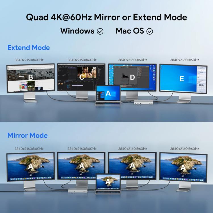 3. Rotation & Clamshell Mode:Quad display capabilities provide crystal-clear visuals to make multitasking a breeze. Our dock also supports both rotation and clamshell modes on Windows, making it versatile enough for any worker's needs.Please note: Mac users will require Mac OS 12.0 or above to support both display rotation and clamshell mode.