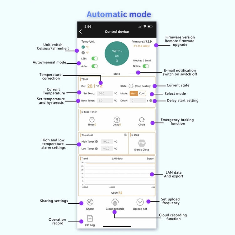 4. With cloud temperature records, switching action WeChat, e-mail notification, local buzzer alarms