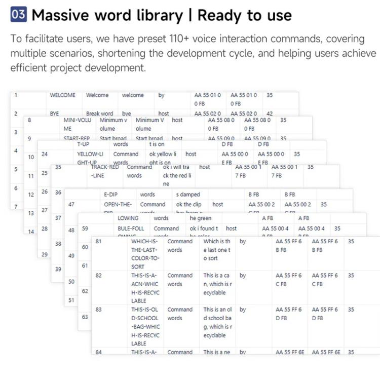 2. Preset 110+ voice commands, support custom Chinese and English command words. Users can modify the command words through the exclusive web page we provide, generate a new firmware file, and write the firmware to the module through PC software, the module will recognize new commands. Built-in storage space 2M, up to about 120 command words can be written.
