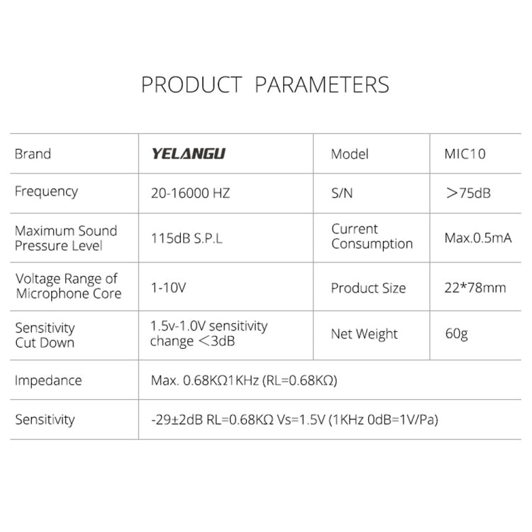 2. Sensitivity: -29+/-2dB RL=0.68Kohms Vs=1.5V( 1KHz 0dB=1V/Pa)