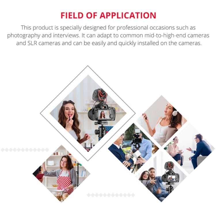 This product is specially designed for professional occasions such as photography and interviews. It can adapt to common mid-to-high-end cameras and SLR cameras, and can be easily and quickly installed on the camera. Using professional-grade anti-noise microphone head, high-definition sound quality, all-metal CNC manufacturing, good shielding performance, not interfered by surrounding signals, the product is small and convenient, and easy to carry.