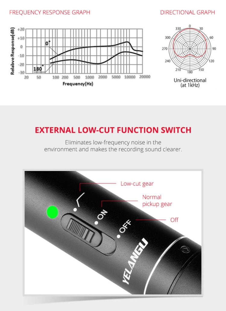 3. The external low-cut function switch eliminates low-frequency noise in the environment and makes the recorded sound quality clearer.